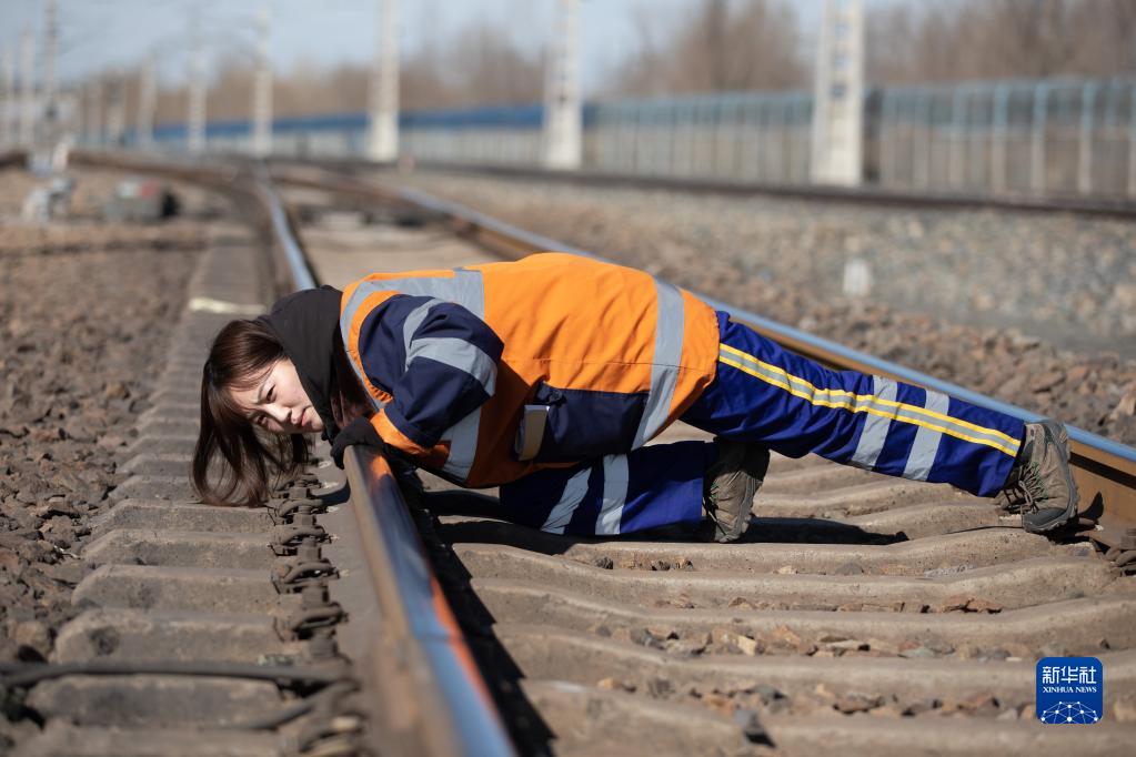 3月6日,在杜爾伯特火車(chē)站9號線(xiàn),女子檢驗班的曹妍趴在鐵道線(xiàn)上觀(guān)察線(xiàn)路高低。