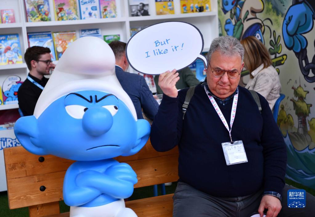3月7日,參觀(guān)者在意大利博洛尼亞國際兒童書(shū)展上與卡通玩偶合影。