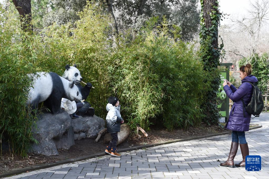 3月7日,小朋友在西班牙馬德里動(dòng)物園與大熊貓雕像合影。
