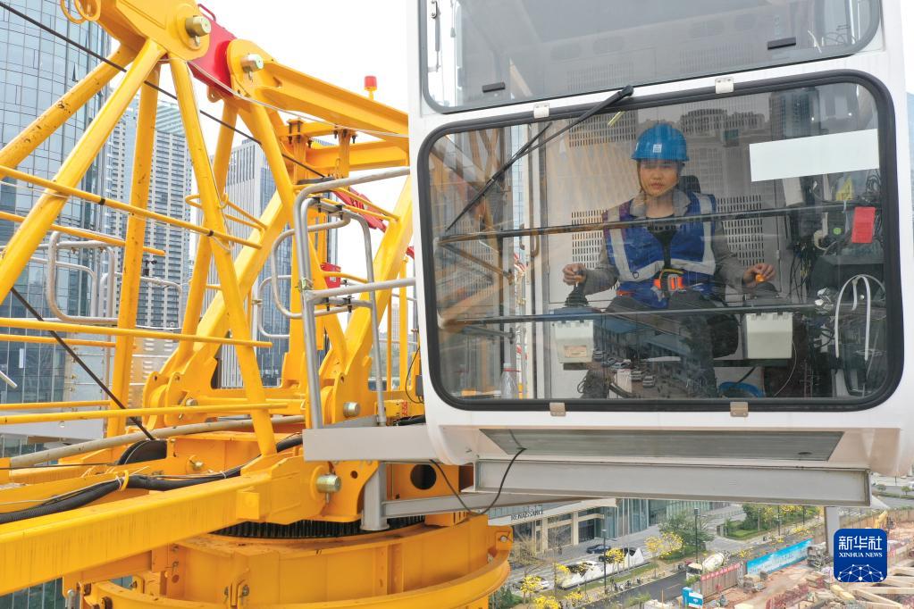3月7日,在廣西南寧市良慶區五象大道中建三局一公司南寧中銀金融中心項目建設工地,覃桂英在開(kāi)塔吊(無(wú)人機照片)。
