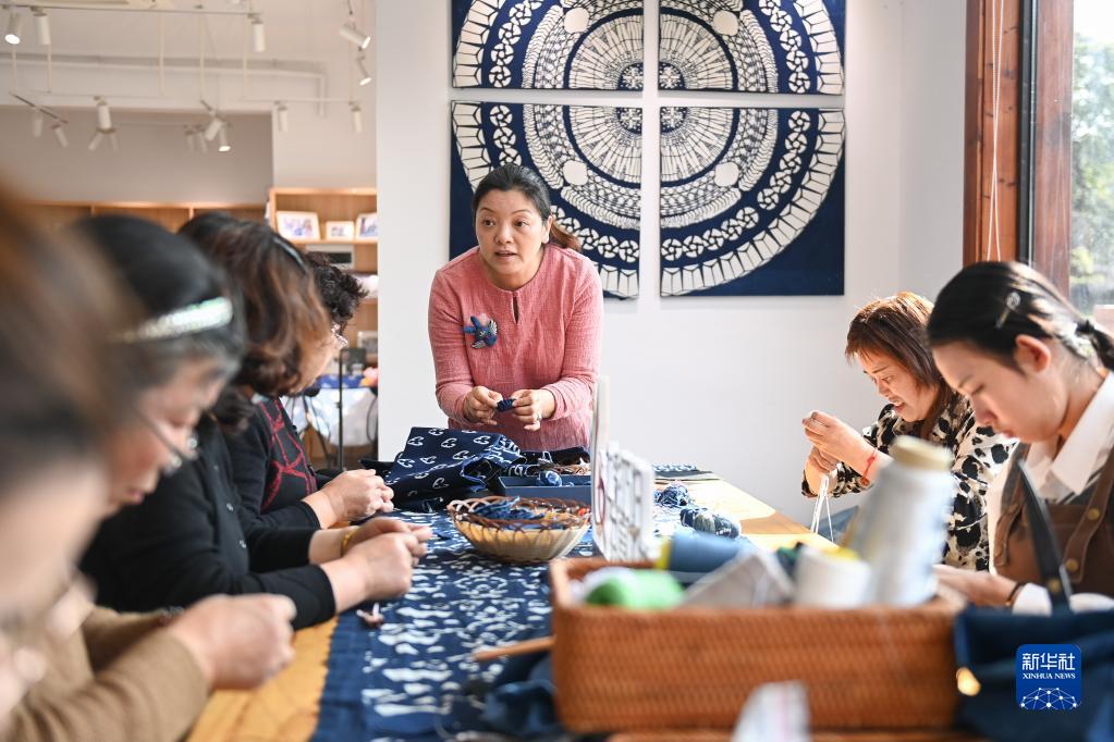 3月8日,在奉化區西塢街道雷山村“七彩巧婦”共富工坊,寧波市非物質(zhì)文化遺產(chǎn)藍印花布印染技藝代表性傳承人張劍峰(中)向村民演示手工飾品的制作方法。目前,該工坊已帶動(dòng)雷山村30余位女性開(kāi)展來(lái)料加工制作。