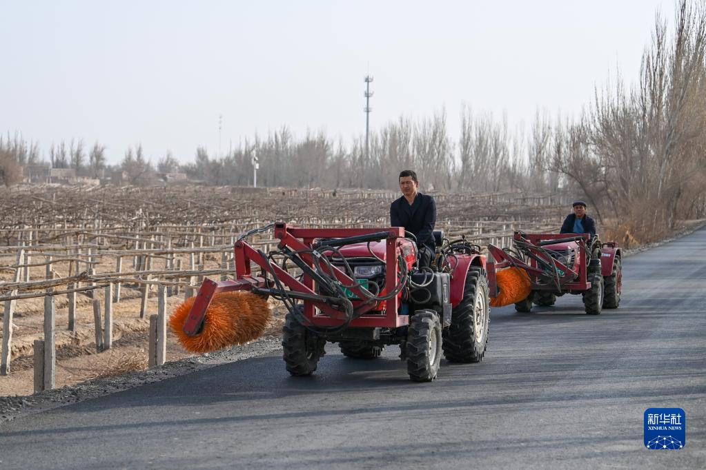 3月8日,在吐魯番市高昌區葡萄鎮,農民駕駛開(kāi)墩機前往葡萄田。