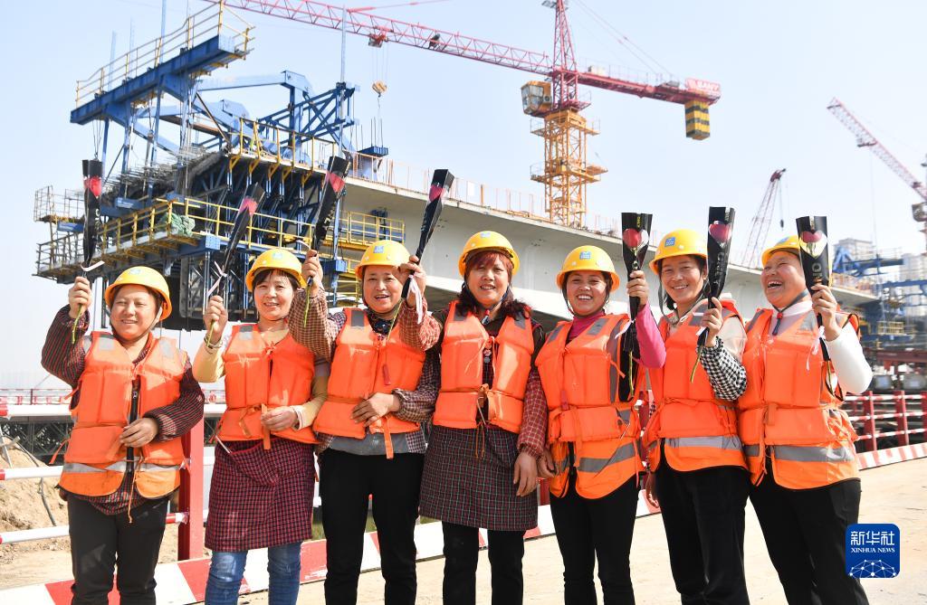3月8日,在位于陜西省西安市國際港務(wù)區的水流路跨灞河大橋項目施工現場(chǎng),中建三局西北公司女工友展示承建單位贈送的鮮花。