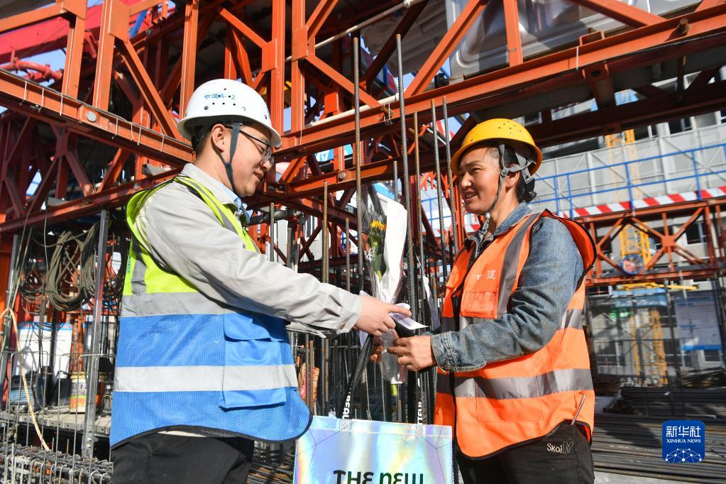 3月8日,在陜西省西安市未央區一處建筑工地,中建三局西北公司鋼筋工賈元會(huì )(右)收到項目管理人員贈送的節日禮品。