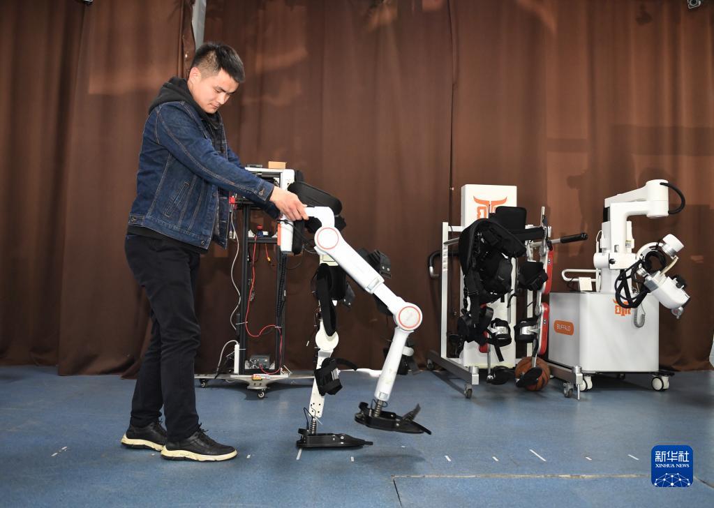 3月6日,電子科技大學(xué)機器人研究中心科研人員在調試外骨骼機器人。