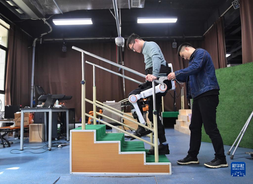 3月6日,電子科技大學(xué)機器人研究中心科研人員在幫一名截癱患者體驗外骨骼機器人上下樓梯康復訓練功能。