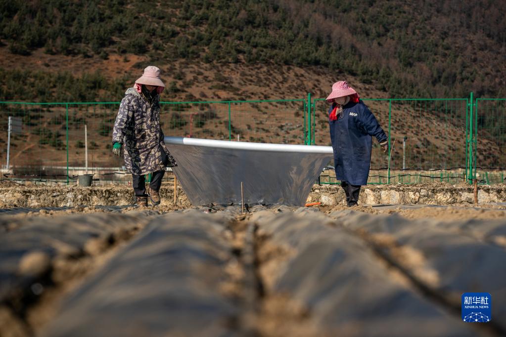 3月8日,在香格里拉市建塘鎮,農民給種植的萵筍覆蓋地膜。