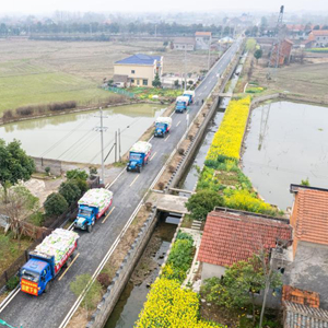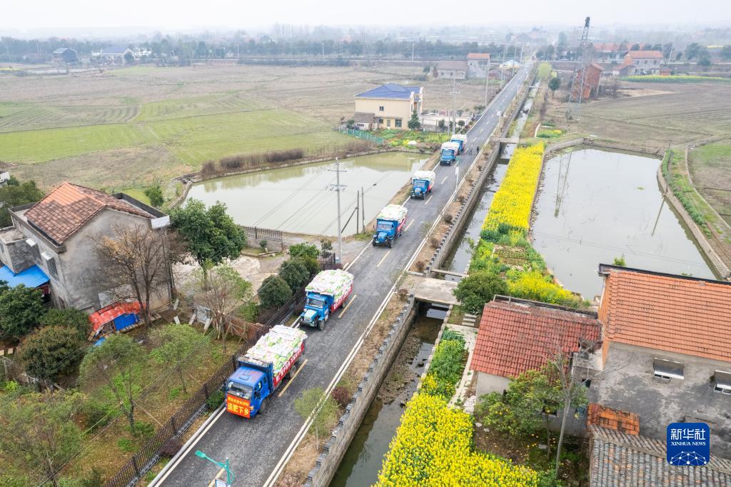 3月8日,送肥下鄉的車(chē)隊行駛在湖南省常德市澧縣夢(mèng)溪鎮的道路上(無(wú)人機照片)。