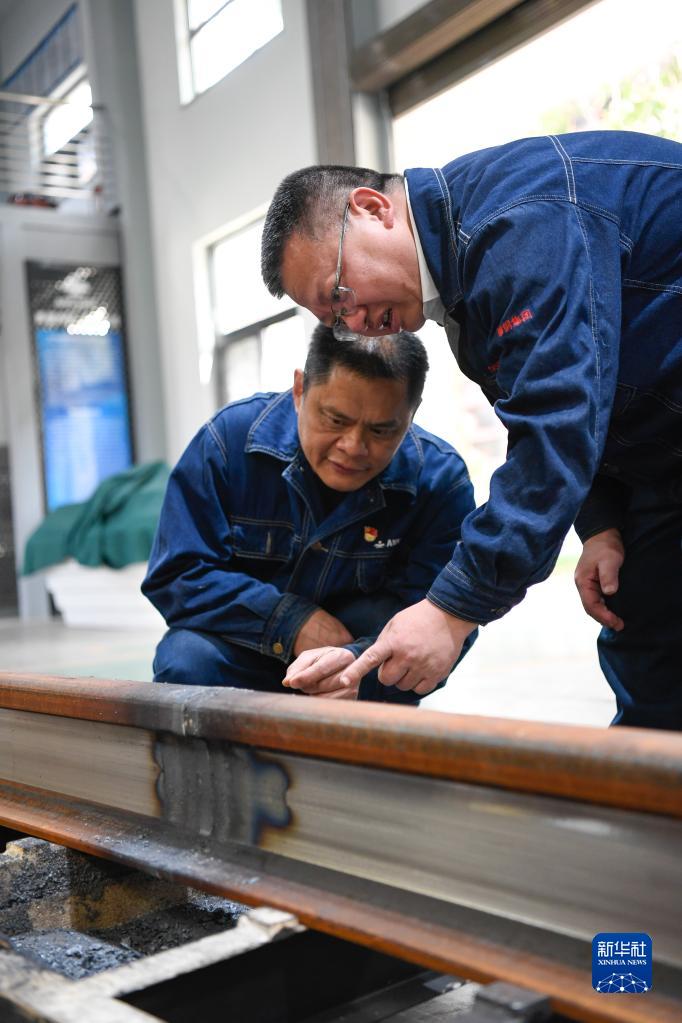 鄒明(右)與同事觀(guān)察軌道焊接實(shí)驗中的焊縫情況(2月21日攝)。