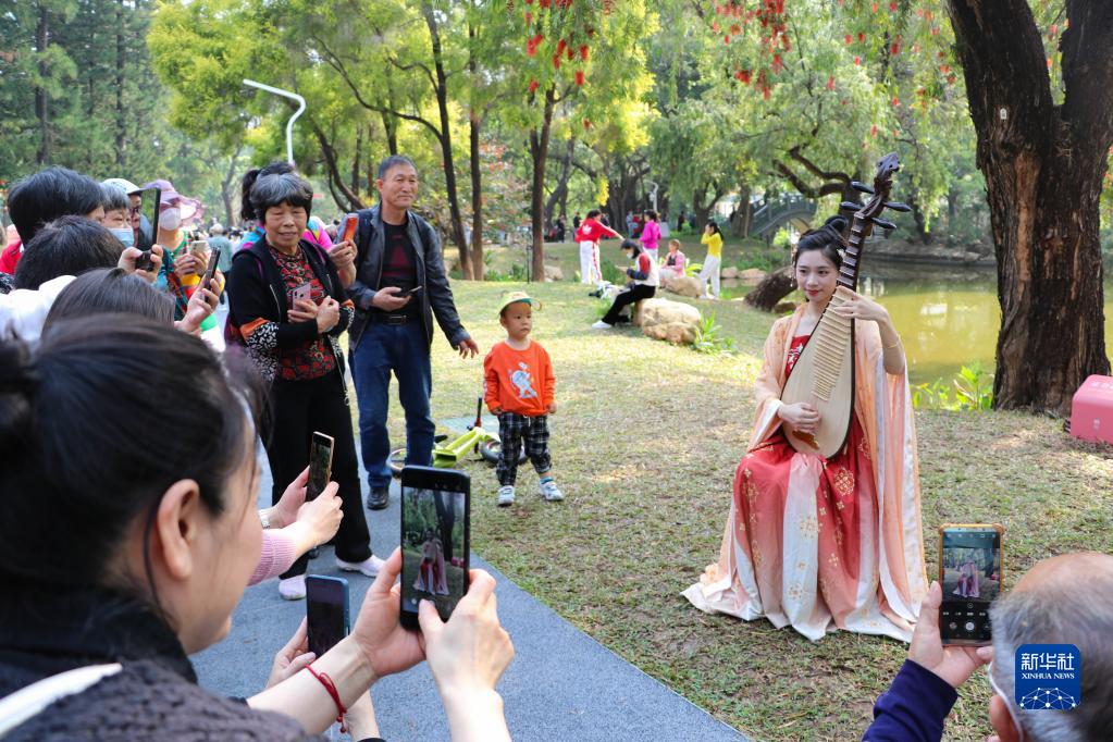 3月8日,游客在深圳人民公園花展現場(chǎng)欣賞樂(lè )器演奏表演。