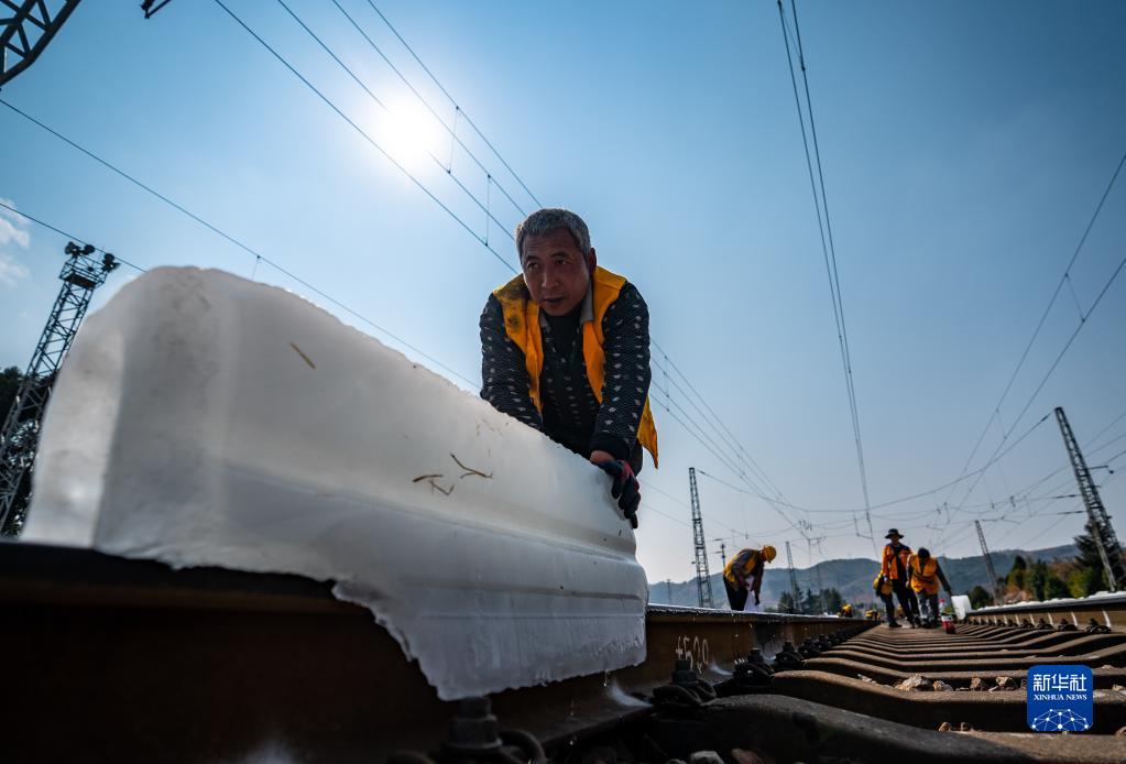 作業(yè)人員在作業(yè)開(kāi)始前利用冰塊對鋼軌進(jìn)行降溫(3月8日攝)。