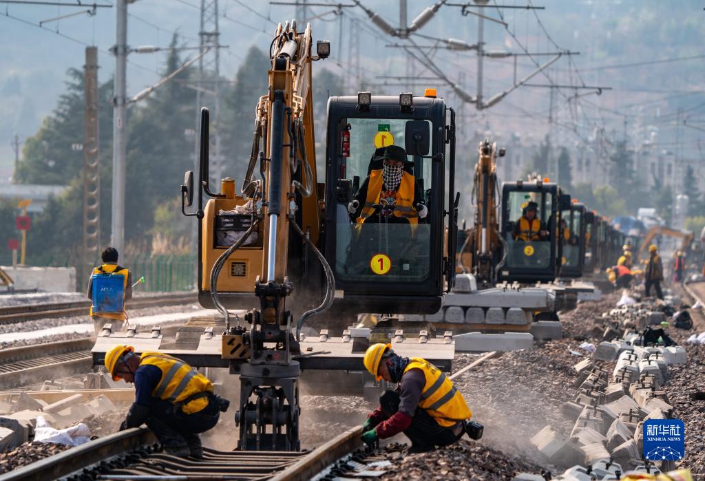 作業(yè)人員操作換枕設備對鐵路進(jìn)行換枕作業(yè)(3月8日攝)。