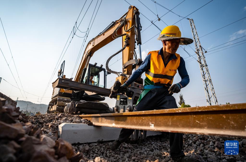 作業(yè)人員操作換枕設備對鐵路進(jìn)行換枕作業(yè)(3月8日攝)。