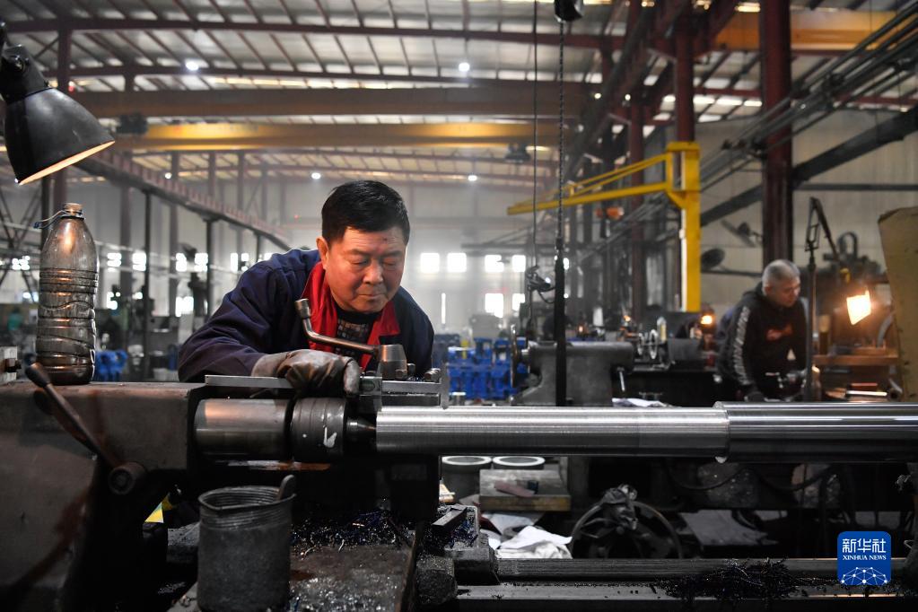在天津市一家科技公司,工人操作車(chē)床加工風(fēng)電機組部件(3月8日攝)。