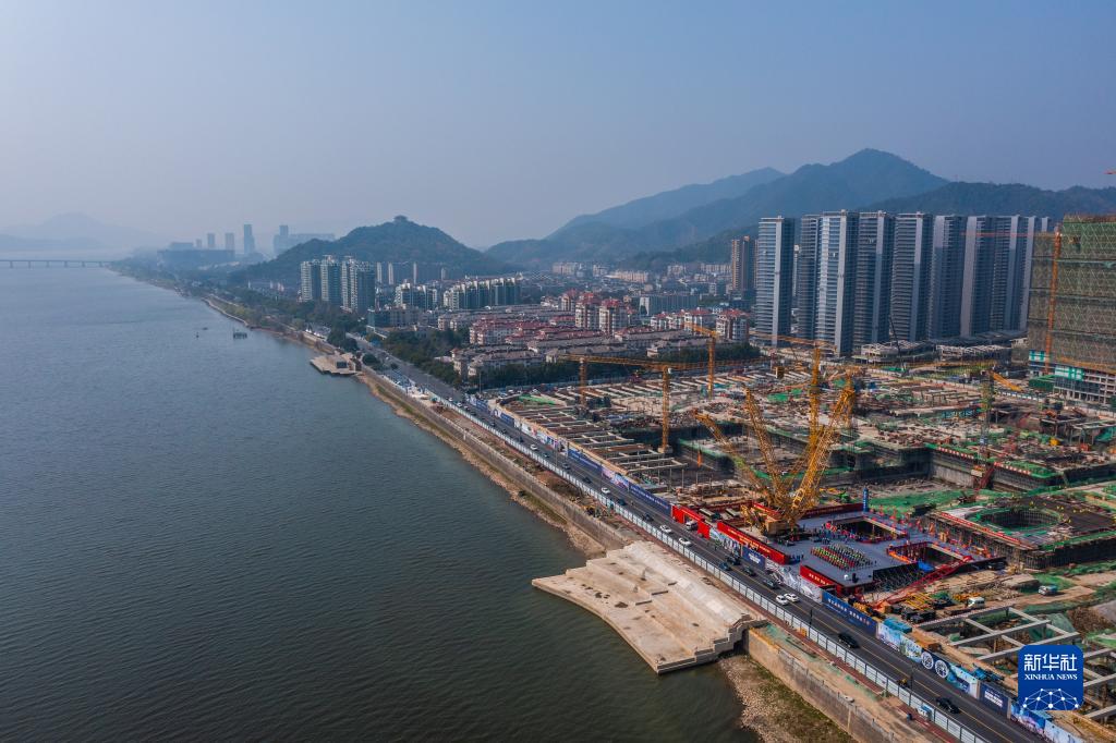 空中俯瞰富春江畔秦望通道工程過(guò)江隧道江北工作井施工現場(chǎng)(3月9日攝,無(wú)人機照片)。