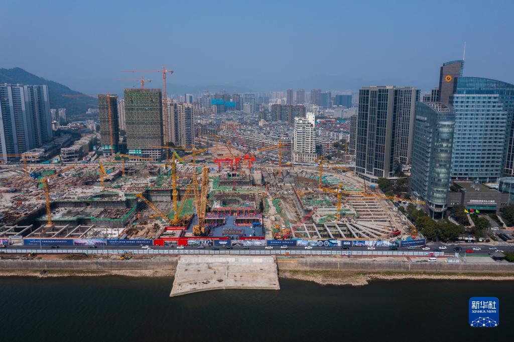 空中俯瞰富春江畔秦望通道工程過(guò)江隧道江北工作井施工現場(chǎng)(3月9日攝,無(wú)人機照片)。