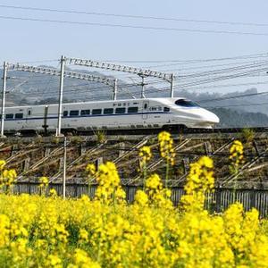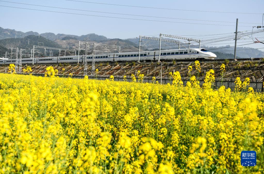 時(shí)下,在貴州省黔東南苗族侗族自治州,油菜花陸續盛開(kāi),動(dòng)車(chē)組列車(chē)穿行其間,美不勝收。