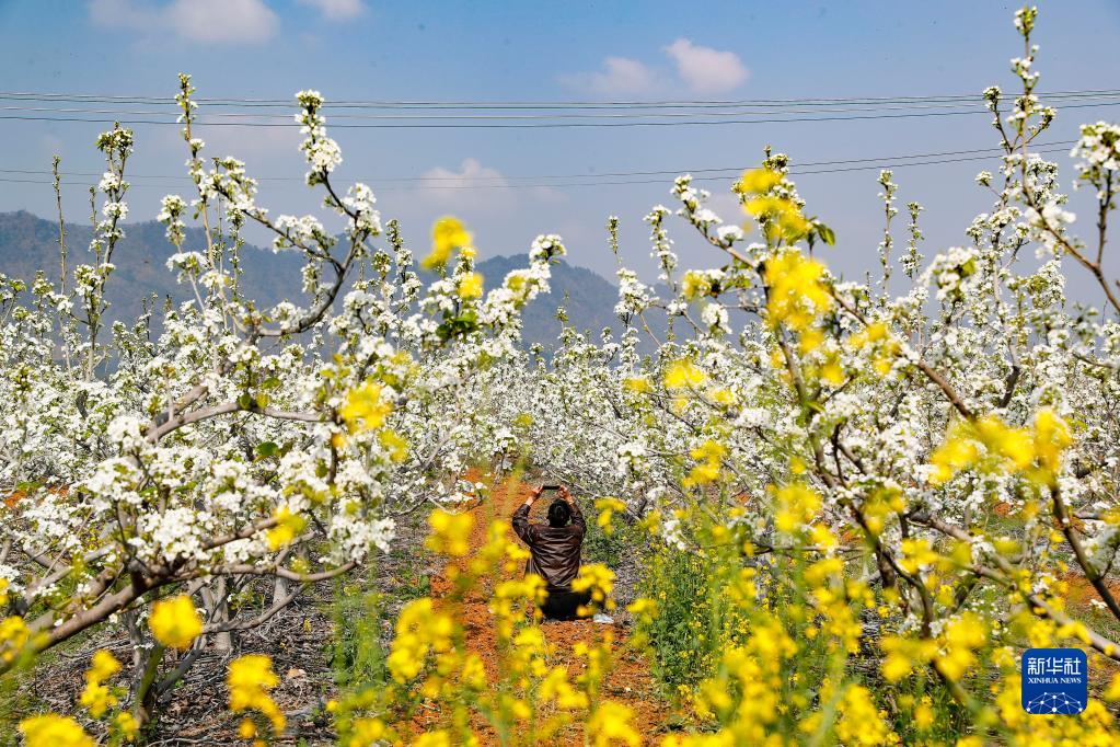 3月9日,一名游客在梨樹(shù)林中拍照。