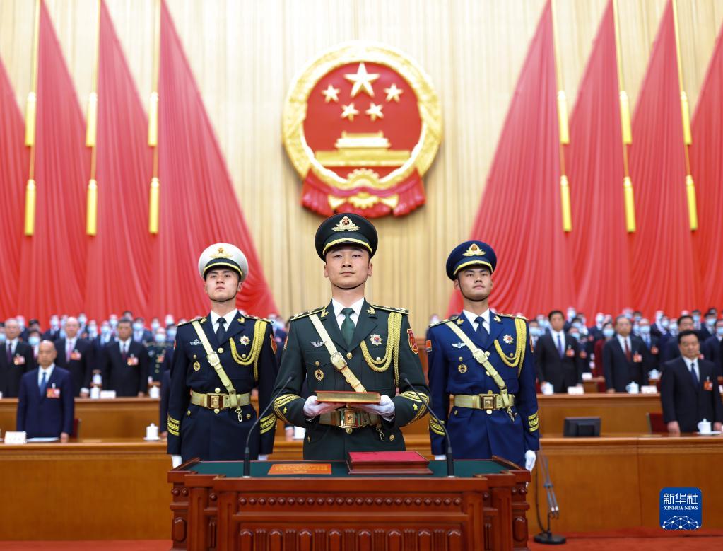 3月10日,中華人民共和國第十四屆全國人民代表大會(huì )第一次會(huì )議憲法宣誓儀式在北京人民大會(huì )堂舉行。主席臺上,3名禮兵護送《中華人民共和國憲法》入場(chǎng)。
