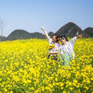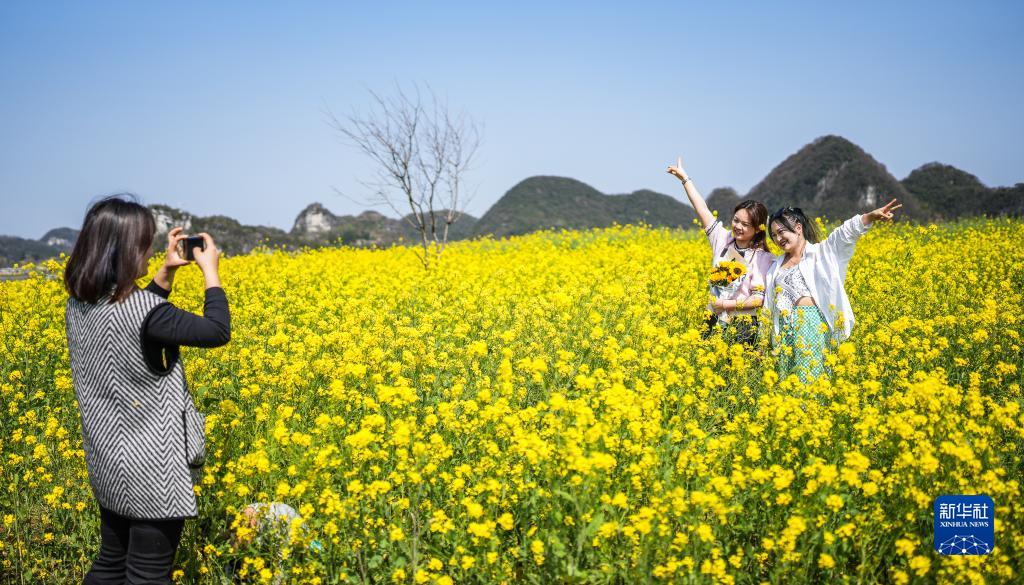 3月9日,游客在貴州省六盤(pán)水市六枝特區木崗鎮瓦窯村的油菜花田里拍照游玩。
