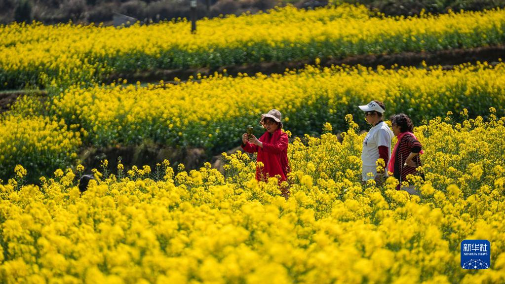 3月9日,游客在貴州省六盤(pán)水市六枝特區木崗鎮瓦窯村的油菜花田里拍照游玩。