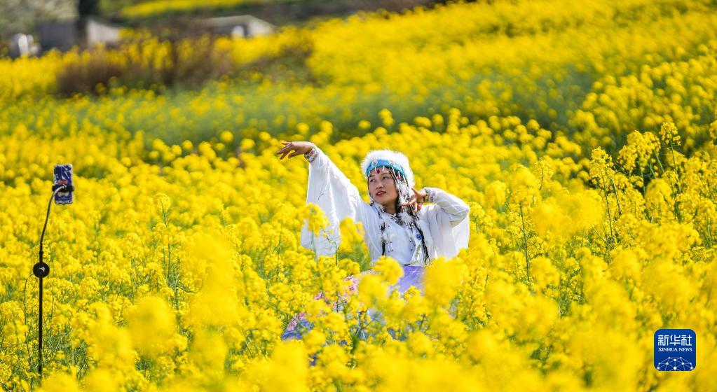 3月9日,游客在貴州省六盤(pán)水市六枝特區木崗鎮瓦窯村的油菜花田里直播舞蹈表演。