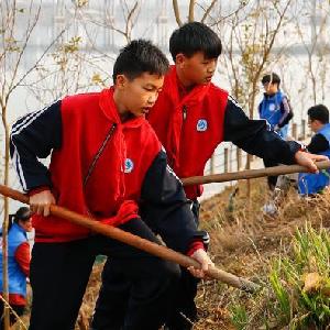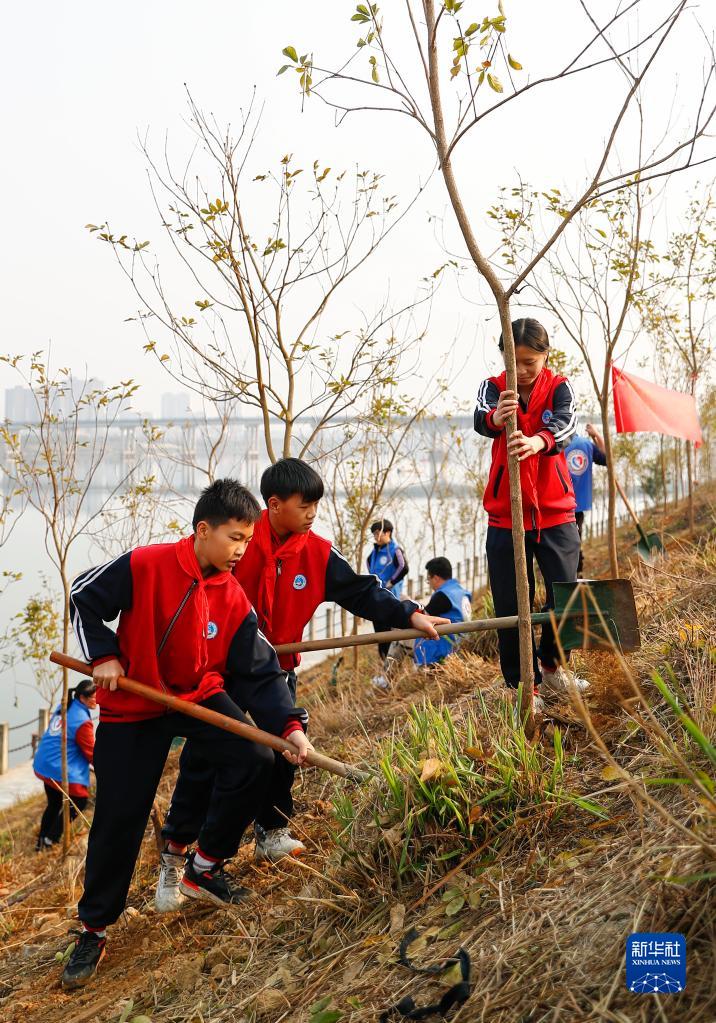 3月10日,在廣西柳州市融安縣,學(xué)生在融江沿岸植樹(shù)。