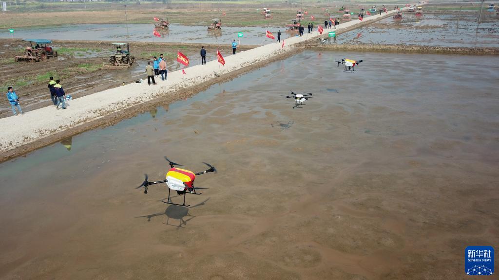 3月10日,在湘鄉市龍洞鎮泉湖村,農機手操作植保無(wú)人機在農田里比賽(無(wú)人機照片)。