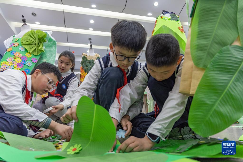 3月10日,重慶市九龍坡區鐵路小學(xué)的學(xué)生們在制作環(huán)保服裝。