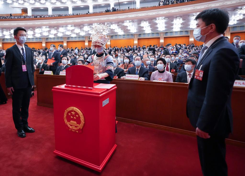3月10日,十四屆全國人大一次會(huì )議在北京人民大會(huì )堂舉行第三次全體會(huì )議。這是代表在投票。