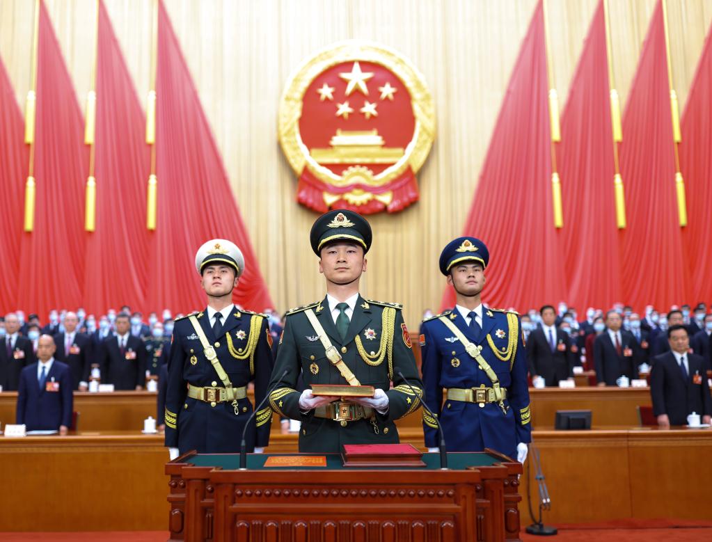 3月10日,十四屆全國人大一次會(huì )議在北京人民大會(huì )堂舉行第三次全體會(huì )議。全體會(huì )議各項議程進(jìn)行完畢后,舉行中華人民共和國第十四屆全國人民代表大會(huì )第一次會(huì )議憲法宣誓儀式。這是禮兵護送《中華人民共和國憲法》入場(chǎng),并將憲法放置于宣誓臺上。