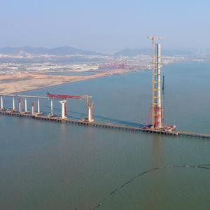 目前,黃茅??绾Mǖ栏邫诟鄞髽驏|主塔已經(jīng)封頂、西主塔和黃茅海大橋三座主塔也臨近封頂,海上陸上基樁、承臺、墩柱、箱梁架設進(jìn)展順利,長(cháng)虹臥波的黃茅??绾Mǖ离r形初現。