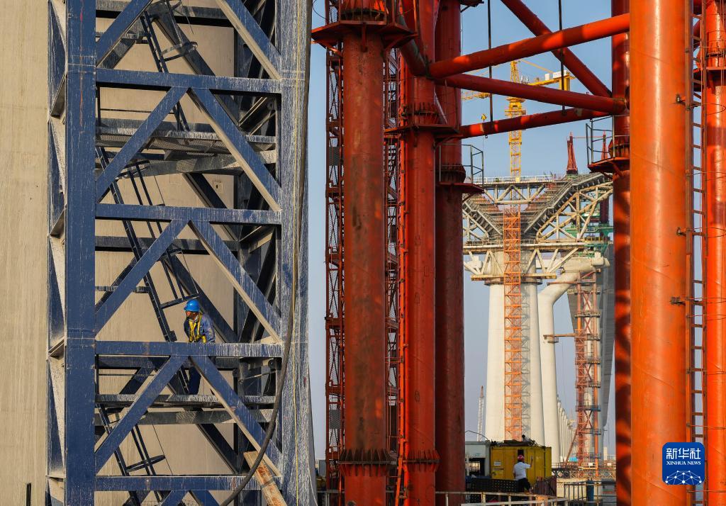 目前,黃茅??绾Mǖ栏邫诟鄞髽驏|主塔已經(jīng)封頂、西主塔和黃茅海大橋三座主塔也臨近封頂,海上陸上基樁、承臺、墩柱、箱梁架設進(jìn)展順利,長(cháng)虹臥波的黃茅??绾Mǖ离r形初現。