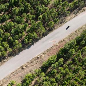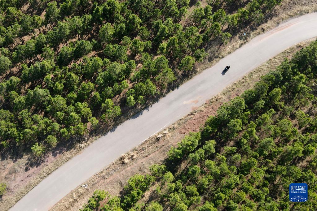 3月10日,張偉騎著(zhù)電動(dòng)車(chē)在五河縣朱頂鎮陸沖山的山林中巡護(無(wú)人機照片)。