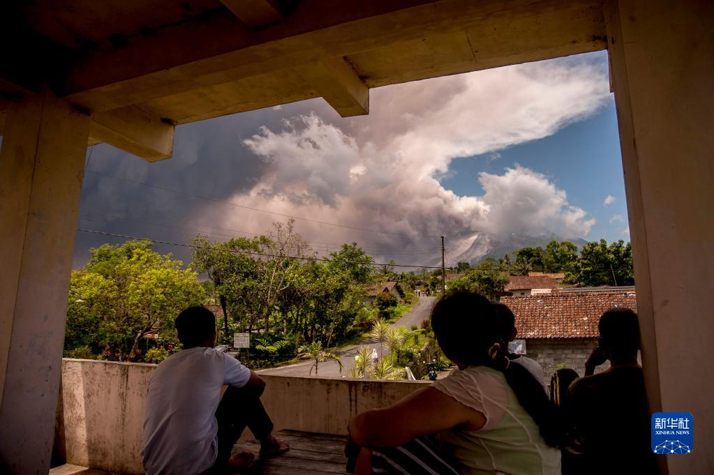 3月11日,在印度尼西亞日惹,人們望向噴發(fā)的默拉皮火山。