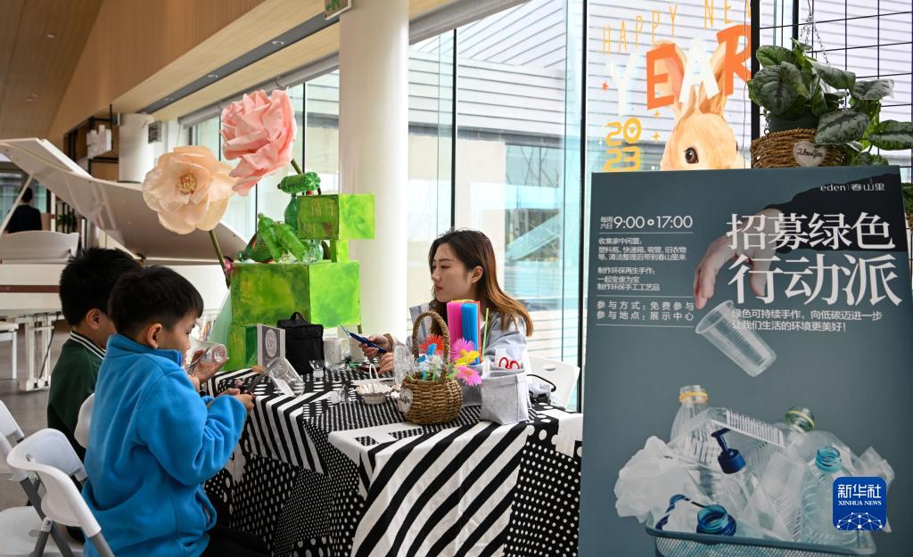 3月11日,在天津市薊州區“eden春山里”生態(tài)教育國際生活示范區,一名老師帶領(lǐng)小朋友進(jìn)行綠色可持續手工創(chuàng )作。