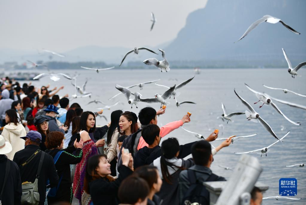 隨著(zhù)天氣轉暖,棲居春城昆明越冬的紅嘴鷗陸續遷徙北返。不少游客到滇池邊觀(guān)鷗喂鷗,為紅嘴鷗送行。