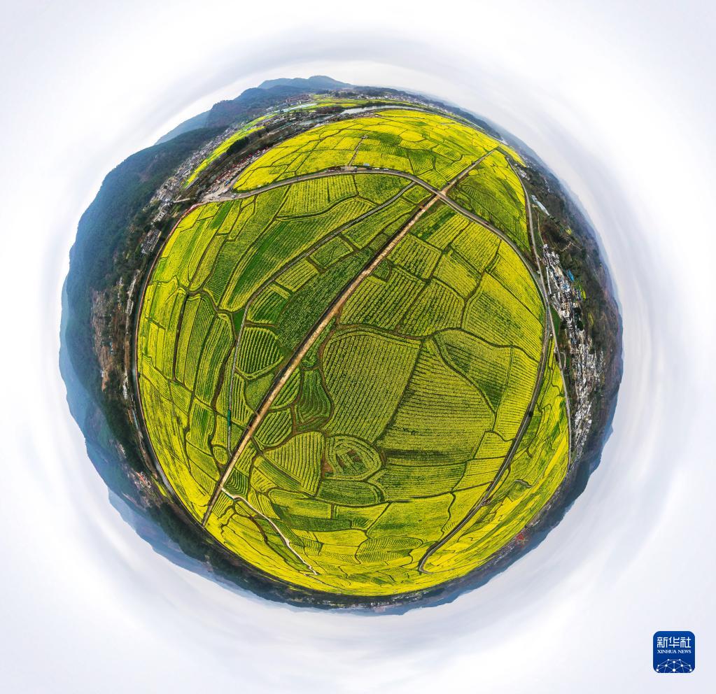 3月12日拍攝的貴州省貴定縣盤(pán)江鎮“金海雪山”景區油菜花田(無(wú)人機全景照片)。