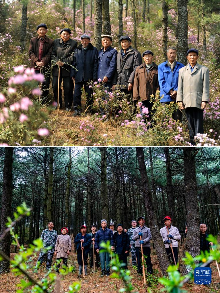 這是一張拼版照片。上圖為:“陸良八老”在花木山林場(chǎng)合影,從左至右分別是王云芳、王家云、王家壽、王家德、王開(kāi)河、王長(cháng)啟、王小苗和王德映(2012年3月29日,新華社記者秦晴攝);下圖為:“陸良八老”之一的王長(cháng)啟(左七)和前來(lái)植樹(shù)的干部群眾合影留念(2023年3月12日,新華社記者江文耀攝)。