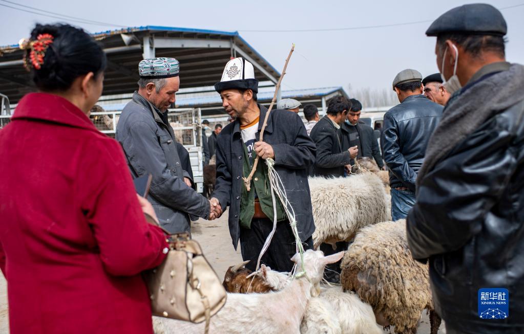 買(mǎi)賣(mài)雙方在新疆莎車(chē)縣米夏鎮的牛羊巴扎上握手議價(jià)(3月12日攝)。