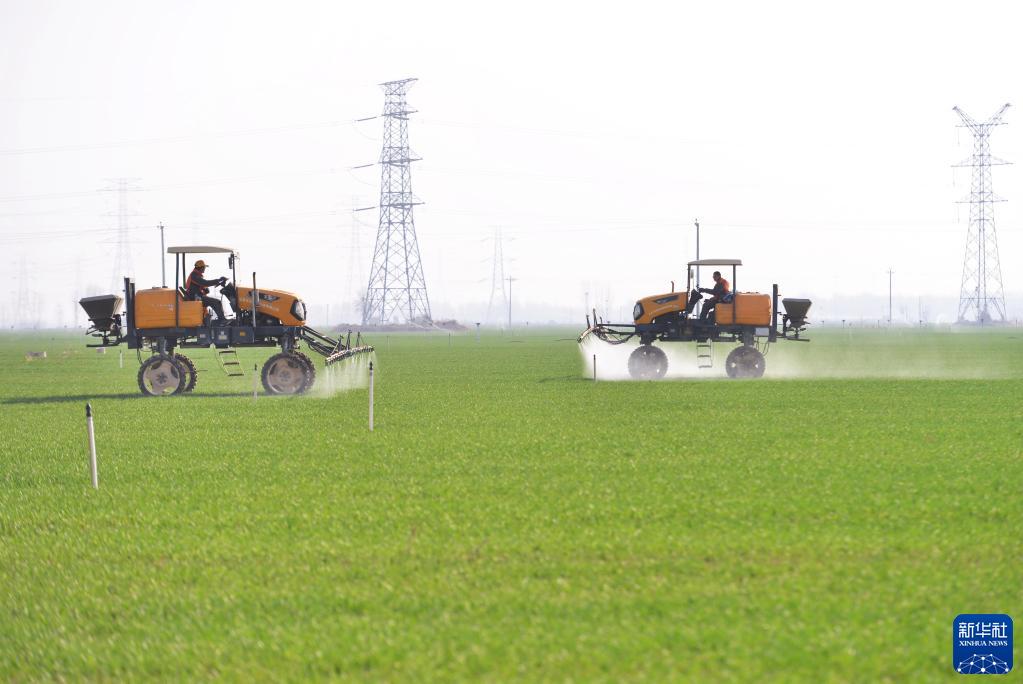 3月14日,河北省晉州市槐樹(shù)鎮北白水村一家農業(yè)合作社的社員在操作機械設備給冬小麥噴灑農藥。