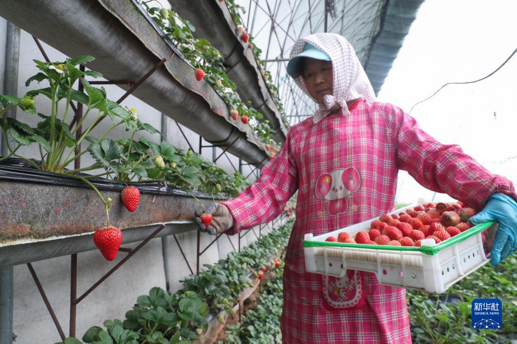3月14日,村民在岫巖縣洋河鎮的草莓大棚采摘草莓。