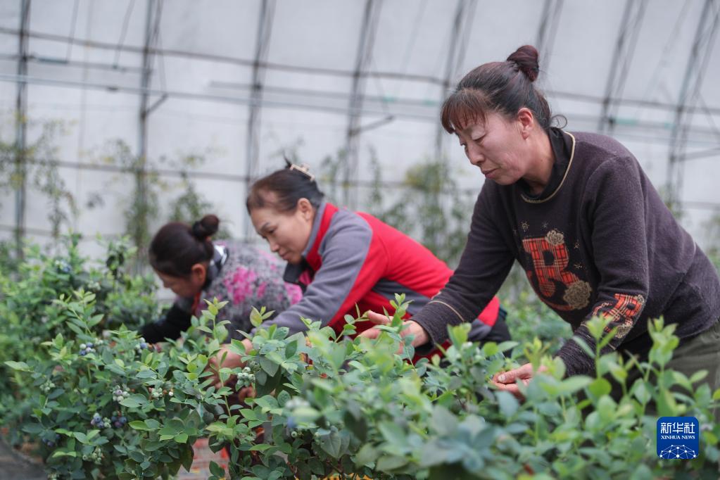 3月14日,村民在岫巖縣洋河鎮的藍莓大棚采摘藍莓。