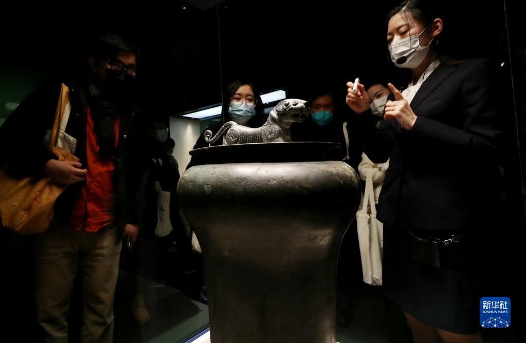 3月14日,參觀(guān)者在戰國青銅虎鈕錞于展柜前聽(tīng)講解員介紹展品細節。