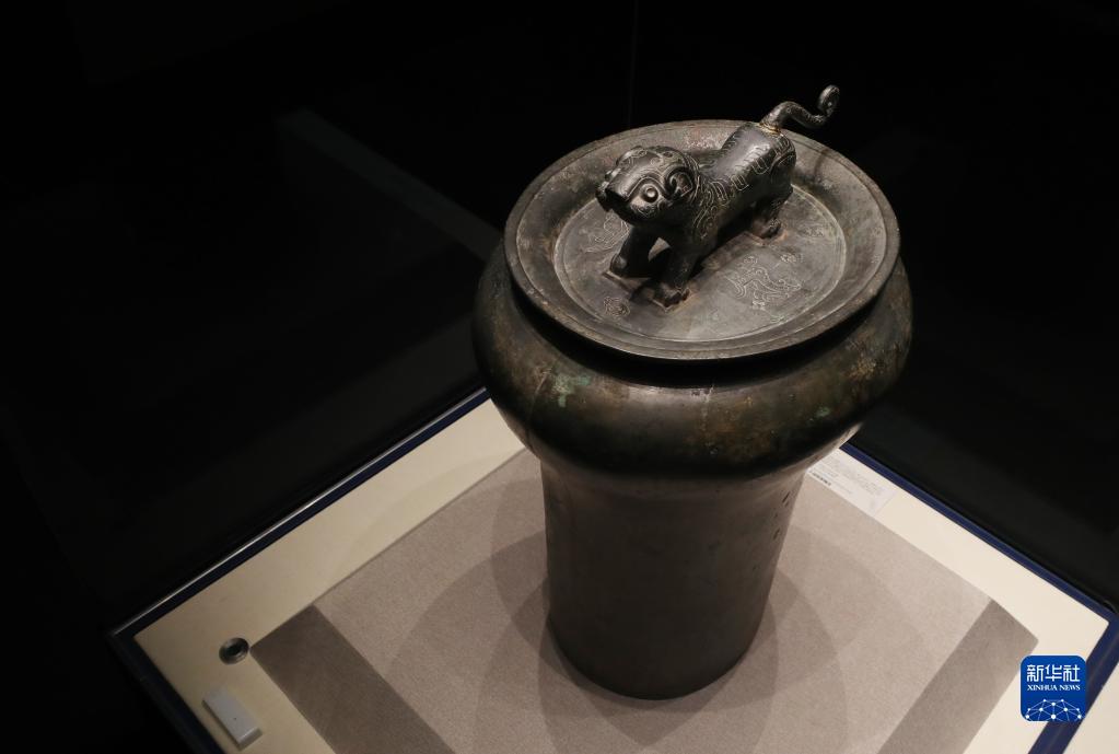 3月14日拍攝的在展覽中展出的戰國青銅虎鈕錞于。