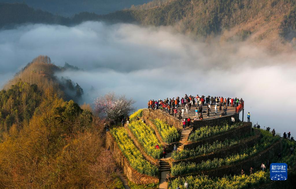 3月14日,游人在欣賞云海美景(無(wú)人機照片)。