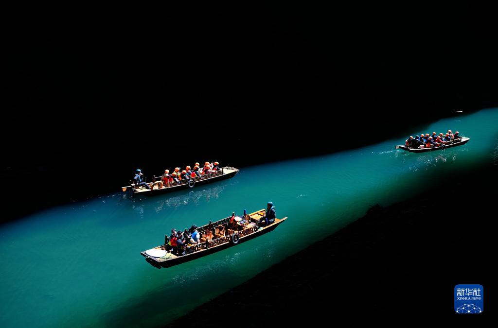 湖北省恩施土家族苗族自治州鶴峰縣容美鎮屏山村屏山旅游景區河水清澈見(jiàn)底,舟行水上如懸浮空中,美如畫(huà)卷。