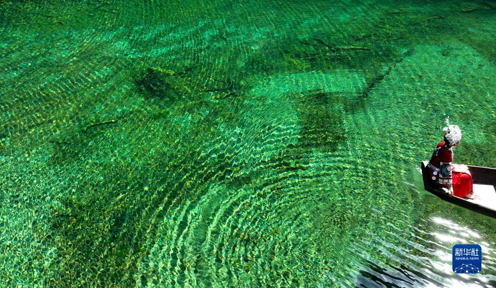 湖北省恩施土家族苗族自治州鶴峰縣容美鎮屏山村屏山旅游景區河水清澈見(jiàn)底,舟行水上如懸浮空中,美如畫(huà)卷。