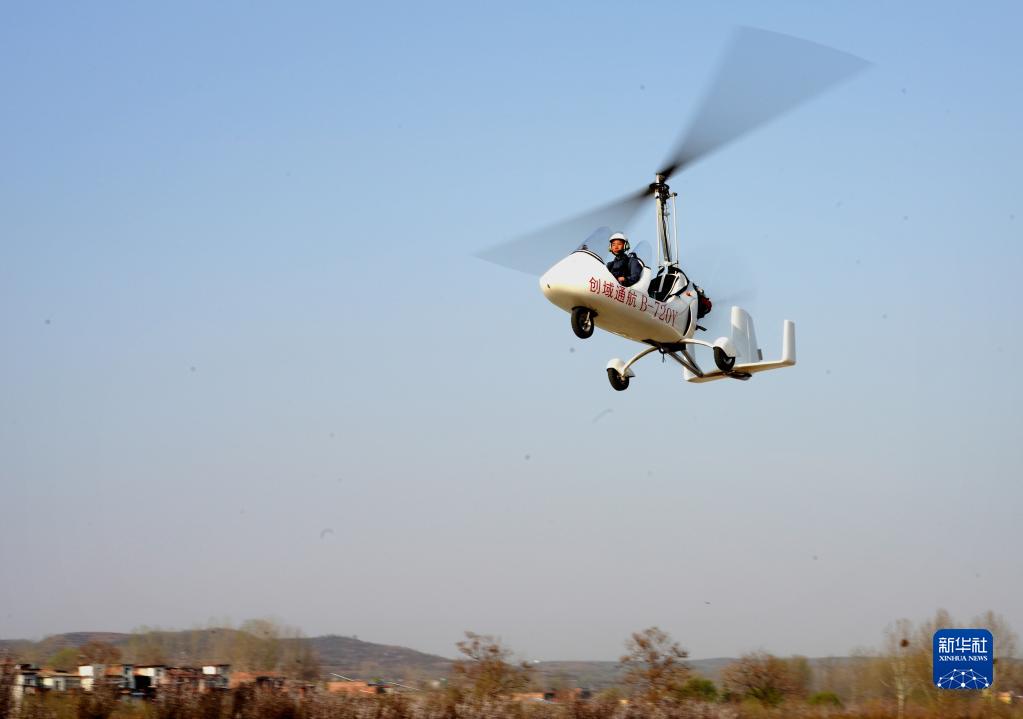 3月14日,楊世誼在洛陽(yáng)市宜陽(yáng)縣的飛行營(yíng)地內駕駛旋翼機進(jìn)行性能測試。