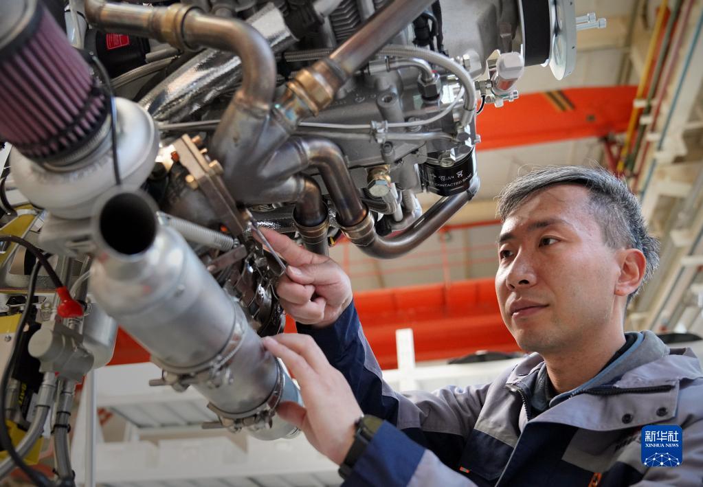 3月14日,在位于洛陽(yáng)市的生產(chǎn)車(chē)間內,楊世誼在安裝發(fā)動(dòng)機排氣管。